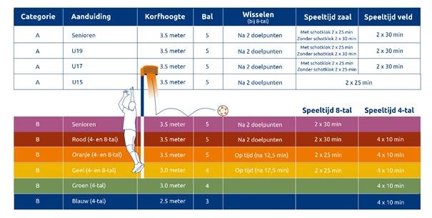 Spelers die zich vast hebben gespeeld in een team in de A-categorie mogen alleen uitkomen in een team in de B-categorie als de gemiddelde leeftijd van de betreffende speler per 31/12 van het competitieseizoen lager is dan de vastgestelde leeftijd van het team. Dit wordt ook weergegeven in de hierboven staande tabel.